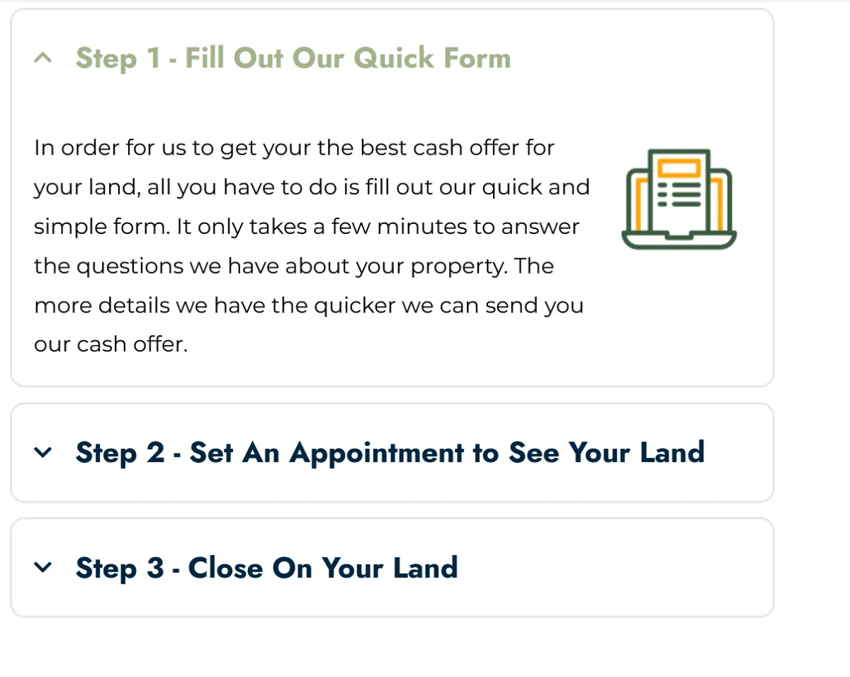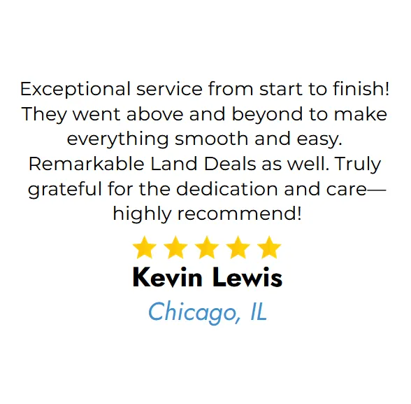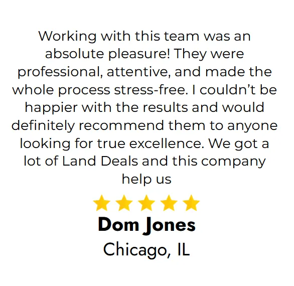 Our company is the absolute best when it comes to buying land, and here's why. First, we provide excellent service that goes above and beyond. We treat every homeowner with respect and kindness, making sure they feel valued and heard. Second, we offer flexible options that work in your favor. Whether you want cash right away or prefer to create selling terms that suit your needs, we've got you covered. We believe in giving land owners choices that make selling their land a breeze.